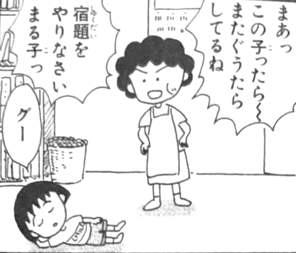 Tama responded with the same enthusiasm, with regular, casual greetings, before she asked Maruko if she was up to go swimming in the neighborhood pool today. Maruko, without hesitation, agreed—forgetting all about the piles of homework sitting on her desk since the beginning of summer. She ran to her room to get ready and tiptoed to sneak out of the house before Okasan noticed.